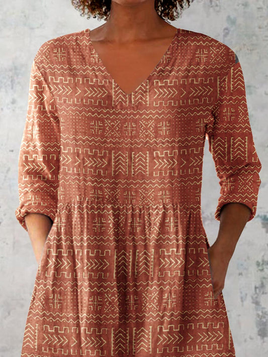 Women's Art Geometric Print V-Neck Cotton and Linen Top