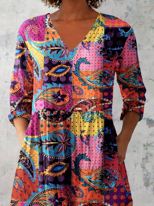 Women's Art Geometric Floral Print V-Neck Cotton and Linen Top