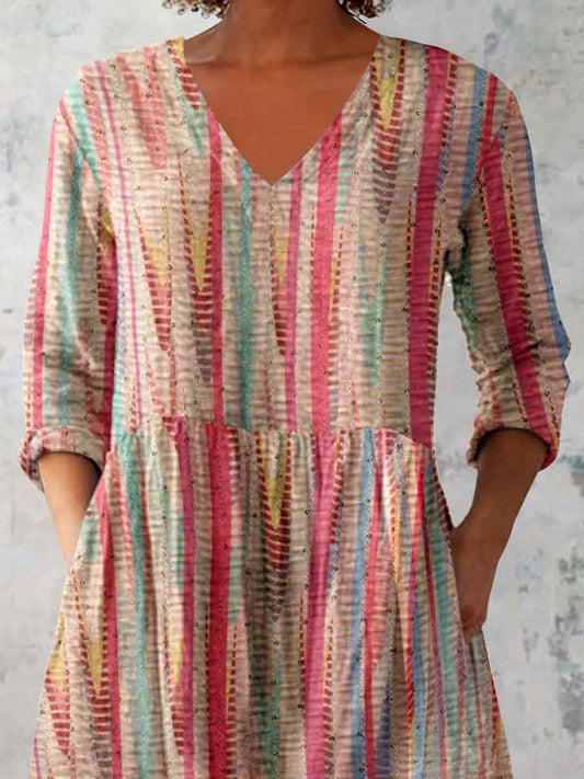 Women's Artistic Striped V-Neck Cotton and Linen Top