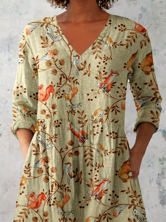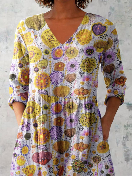Women's Elegant Floral Pattern Round Neck Cotton and Linen Top