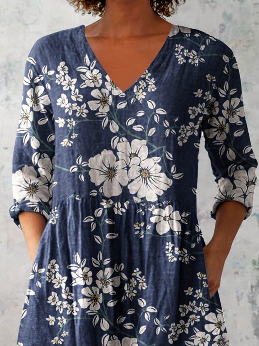 Women's Elegant Floral Print Pattern Shirt Style Cotton and Linen Dress