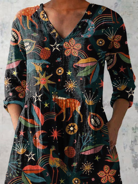 Mythical Horoscope Pattern Printed Women's Casual Linen V-Neck Shirt