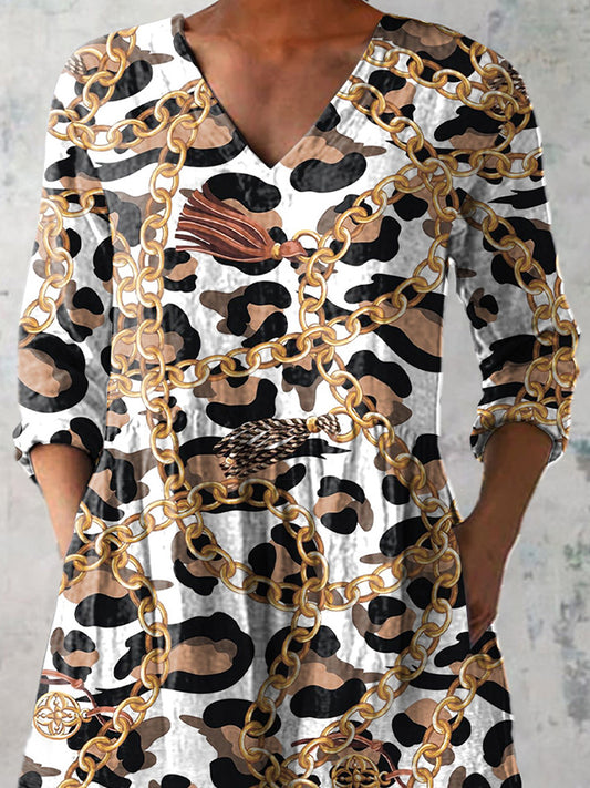 Stylish Gold Chain And Leopard Print Pattern Printed Women's Casual Linen V-Neck Shirt