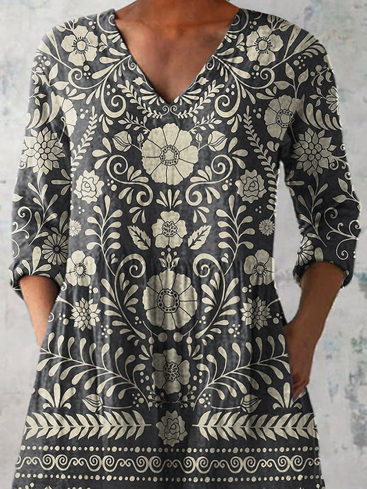 Retro Ethnic Floral Pattern Printed Women's Casual Linen V-Neck Shirt