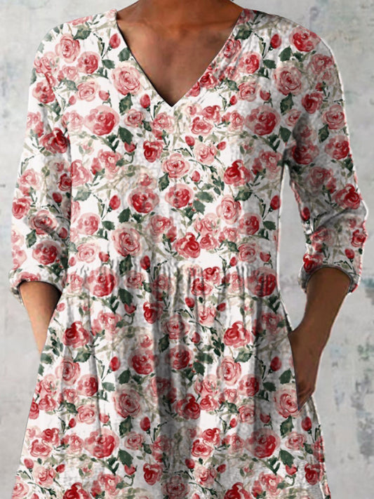 Watercolor French Rose Pattern Printed Women's Casual Linen V-Neck Shirt