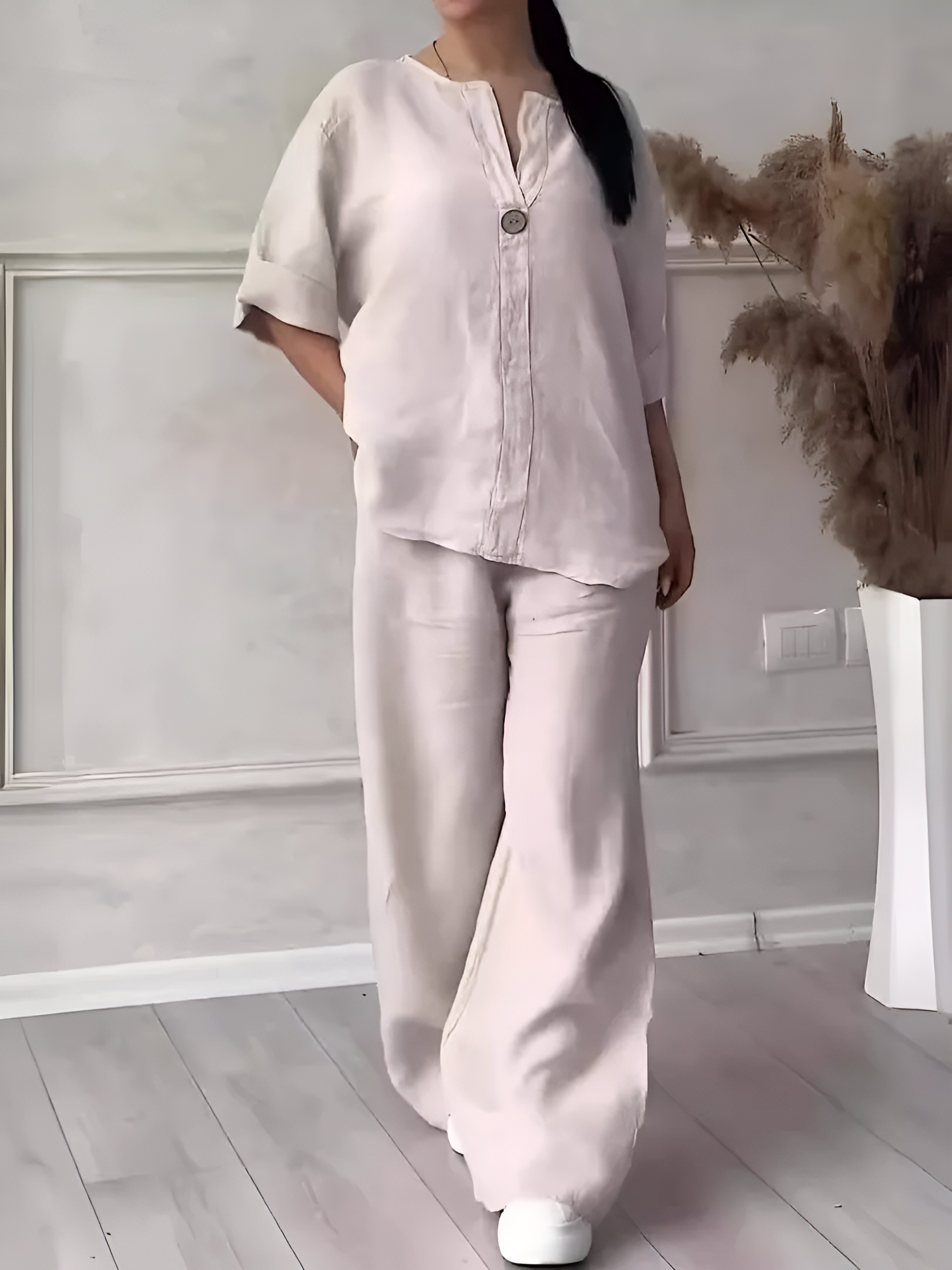 This set embodies the trend of relaxed summer essentials: natural materials, a loose fit, and a clean style. Perfect for a sunny stroll, a coffee with friends, or a relaxing weekend. Light, comfortable, and always elegant.