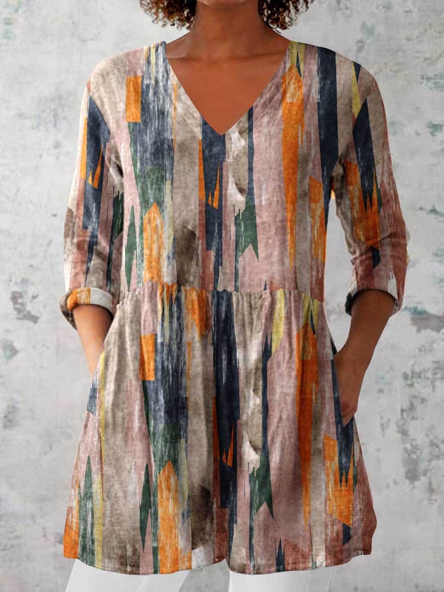 Women's Art Geometric Print V-Neck Cotton and Linen Top