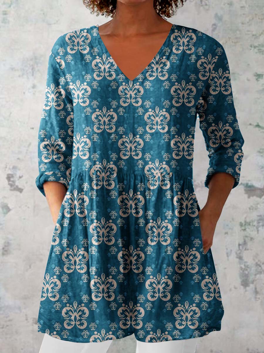 Women's Elegant Floral Print Pattern Cotton and Linen Top