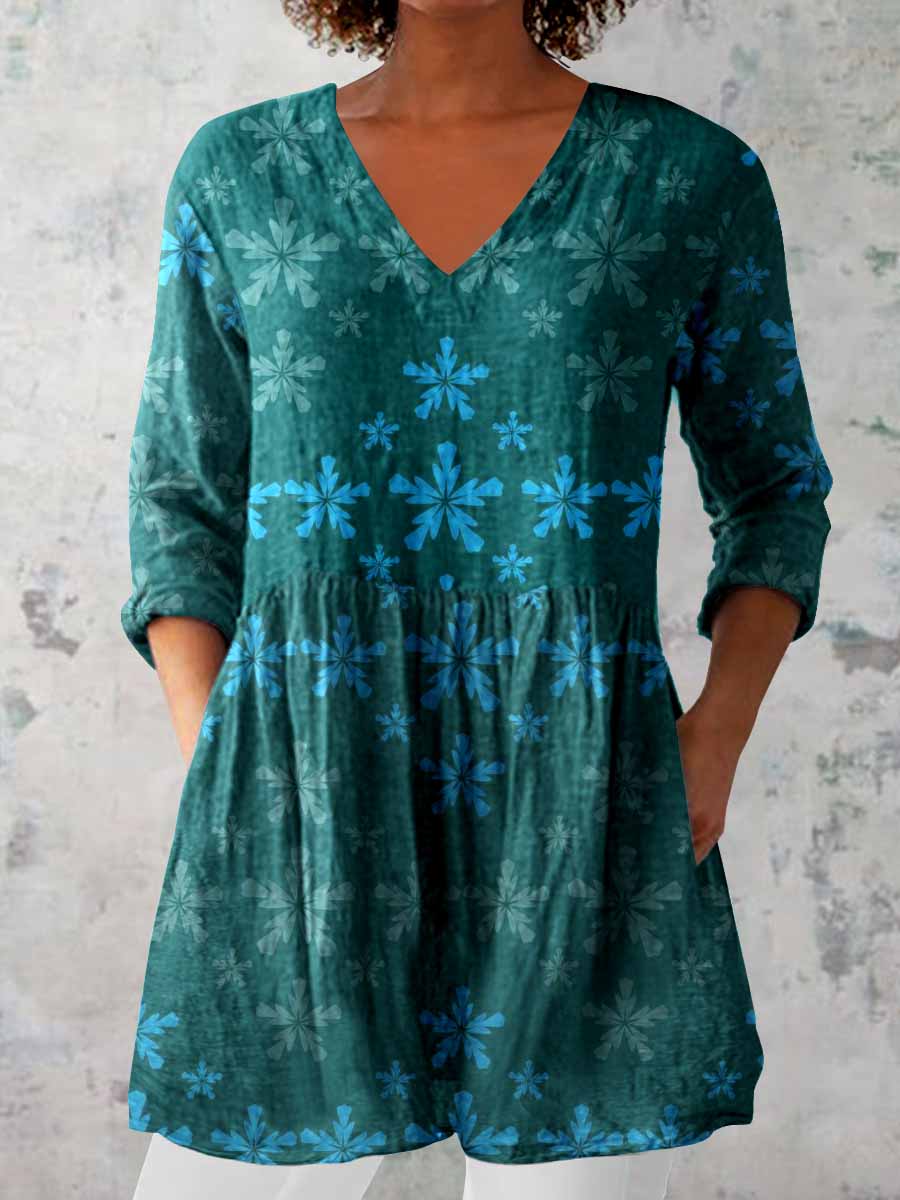 Women's Elegant Floral Print V-Neck Cotton and Linen Top