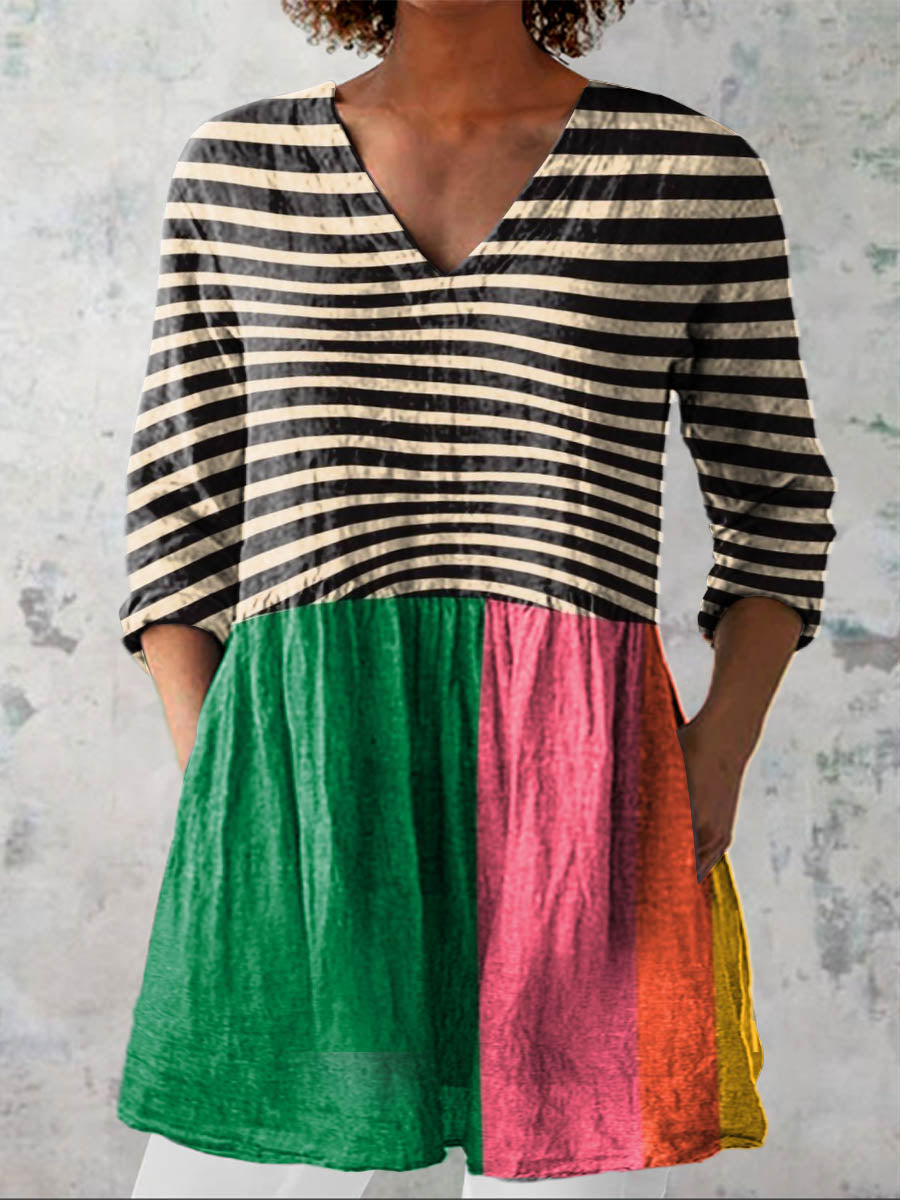 Women's Geometric Line Pattern Art Print Casual Cotton Linen V-neck Shirt