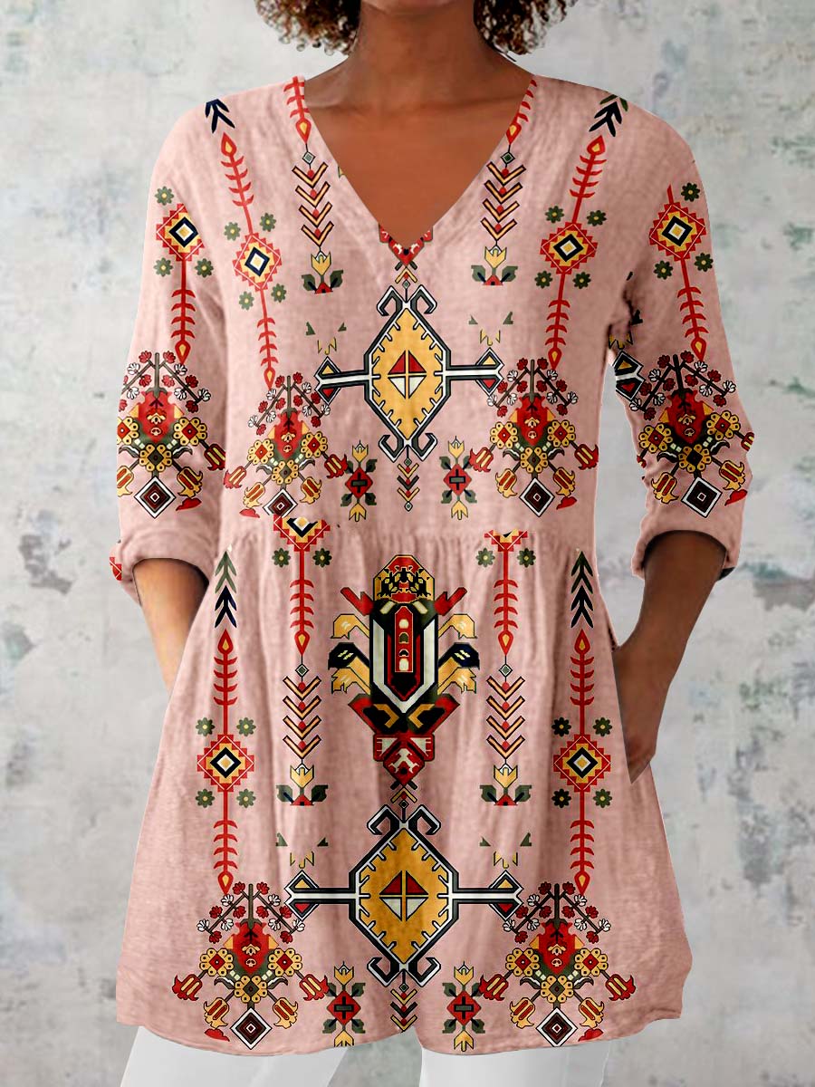 Women's Pellis Geometric Pattern Cotton and Linen V-neck Top