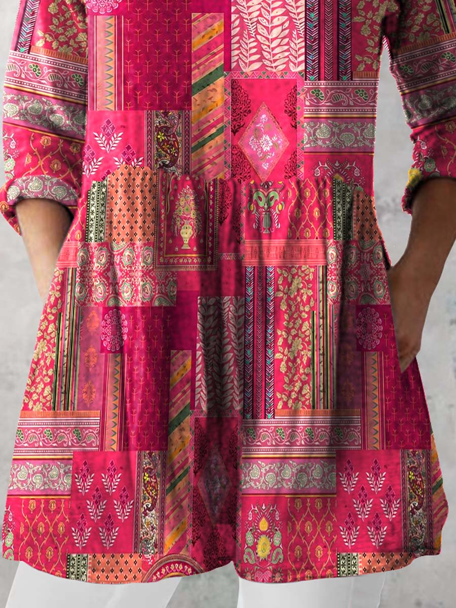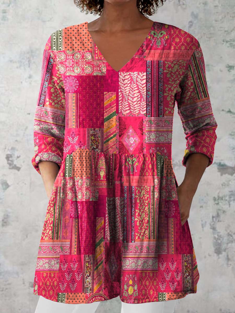 Women's Retro Floral Art Print Casual Cotton And Linen V-neck Top