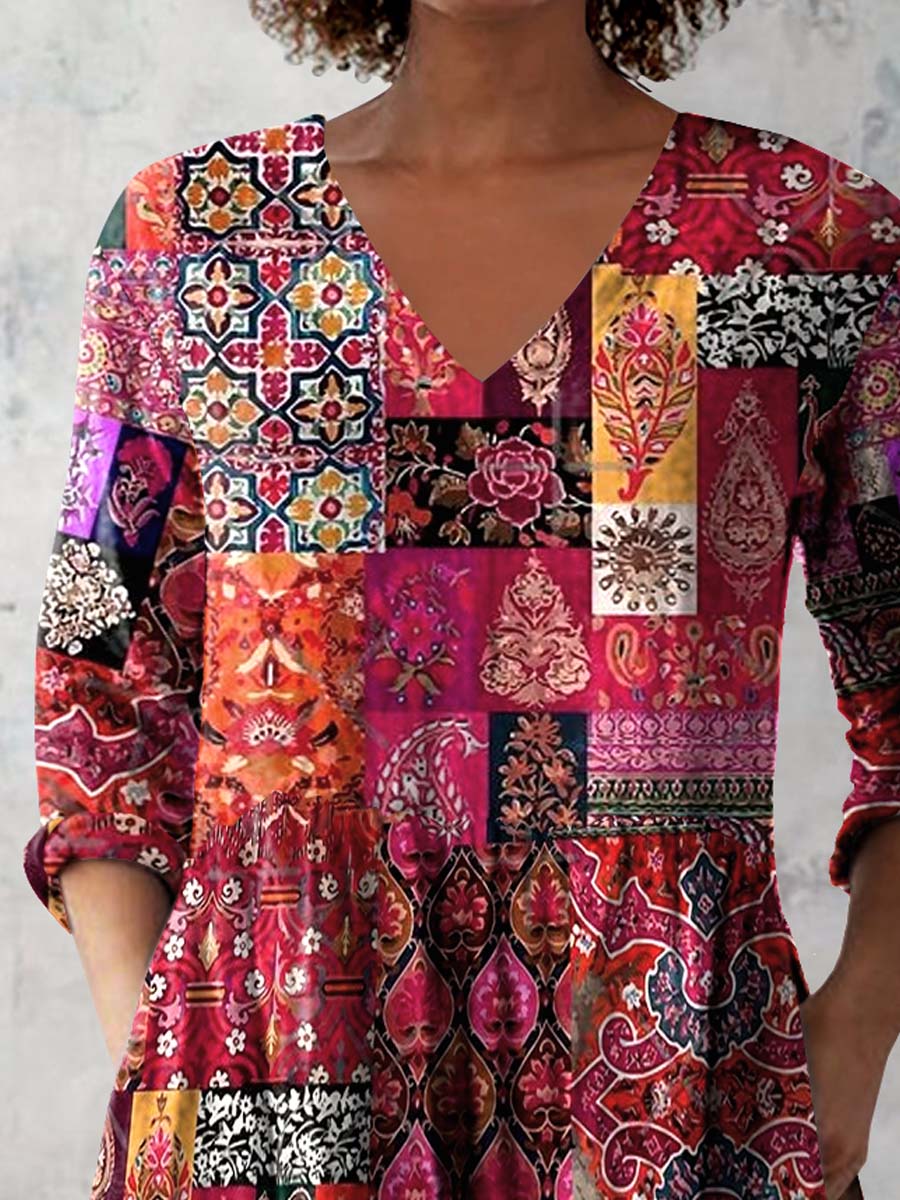 Women's Retro Floral Art Print Casual Cotton And Linen V-neck Top