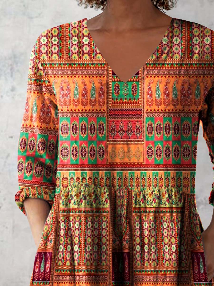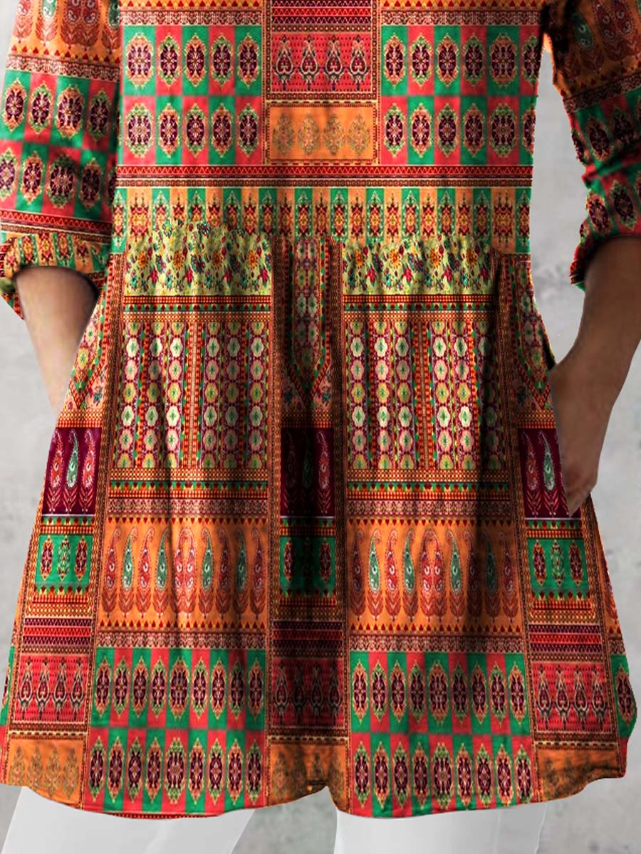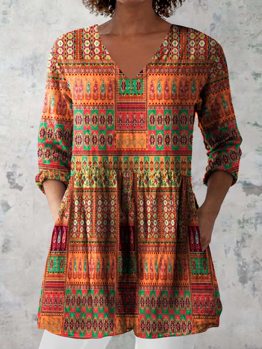Women's Retro Floral Art Print Casual Cotton And Linen V-neck Top