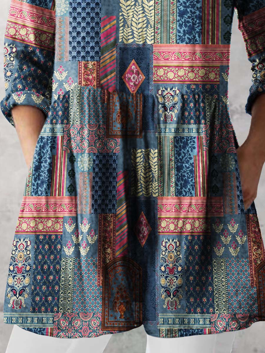 Women's Retro Floral Art Print Casual Cotton And Linen V-neck Top
