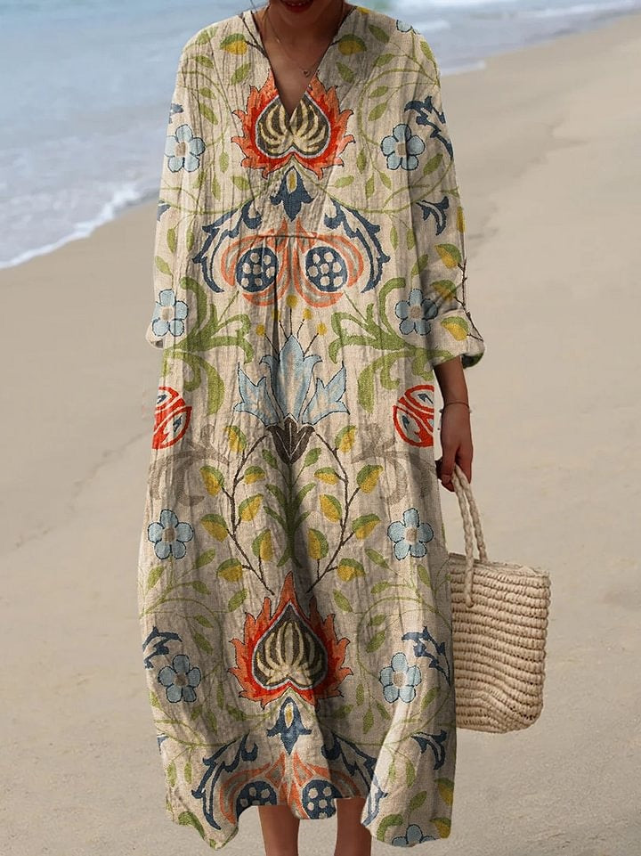Women's Vintage Lovely Floral Pattern Art Print Casual Cotton Linen V-neck Shirt